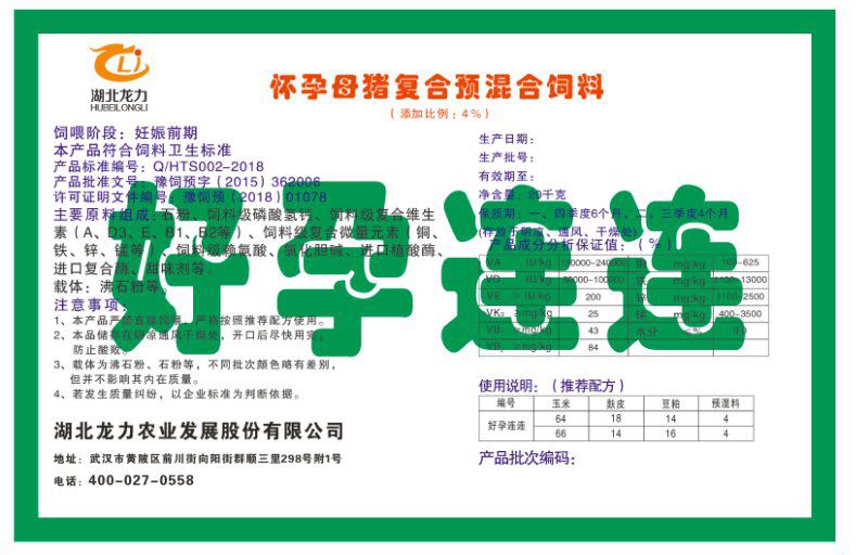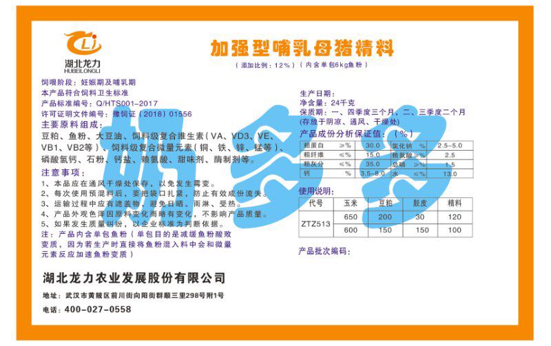 湖北龍力農業發(fā)展股份有限公司坐落于武漢市黃陂區前川街向陽街群順三里298號附1號。公司成立于2014年6月,公司自成立以來把“創(chuàng)全球最大養(yǎng)豬綜合服務”為企業愿景。致力于打造教保料品牌”作為公司發(fā)展的明確目標。公司一直致力于豬營養(yǎng)的研究和開發(fā),積極與國內外高校和科研機構合作,推廣養(yǎng)豬技術、動物營養(yǎng)新概念,向世界農牧企業學習與合作。公司采用國內先進的生產工藝,選擇高精度電子配料秤,高均勻度、無殘留混合機等先進設備....